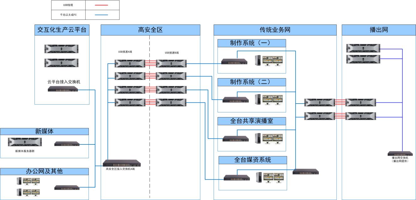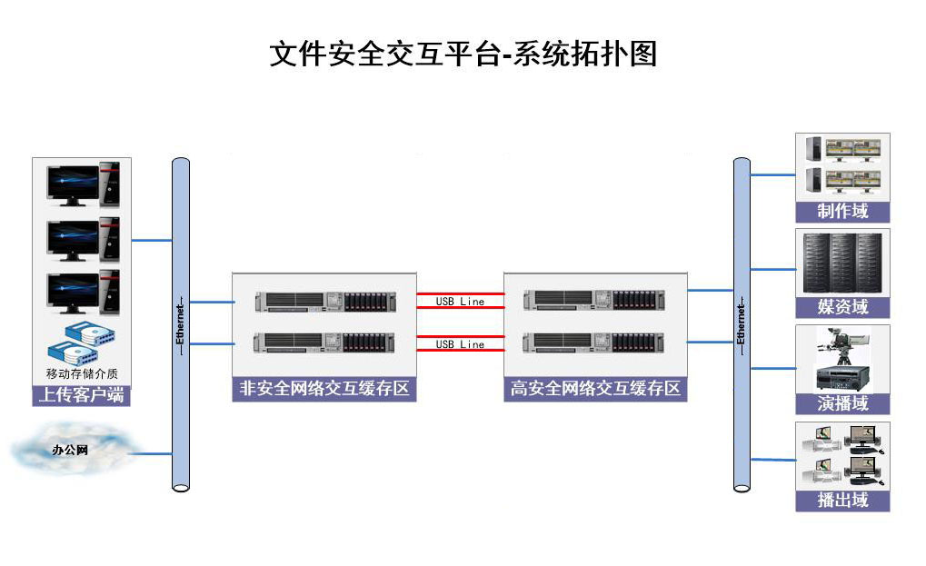 部署在非安全网络和高安全网络(比如办公网到制作网、上载区到播出网等),通过USB链路进行连接,编辑记者可在上载区或办公网中安全进行挑选素材,并传输到高安全网络中。
